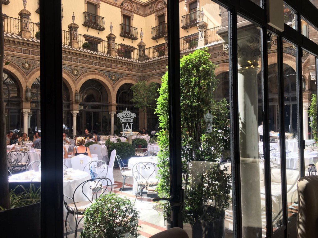Het is nog vroeg in de ochtend als we aankomen in deze stad van de flamenco. We huren fietsen en kiezen voor de historische route,  beschreven op het plattegrondje van de fietsverhuur. Rond drie uur lopen de temperaturen zo hoog op dat we besluiten in te checken in het hotel. Lichtelijk aangeslagen door de warmte (het is inmiddels 34 graden!) stappen we de koele lobby binnen van het smaakvol ingerichte ‘hospes’.